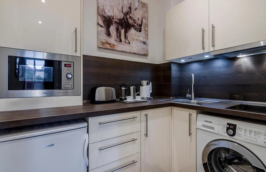 Bu dairede ücretsiz Wi-Fi, televizyon, küçük mutfak gibi imkanların yanı sıra mikrodalga fırın, elektrikli su ısıtıcısı, çay/kahve makineleri ile tam donanımlı mutfak bulunmaktadır. Her oda duş, saç kurutma makinesi, havlular gibi olanaklarla donatılmış özel banyoya sahiptir.